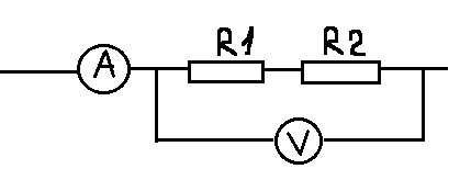 Խնդիր 4.Նկարում պատկերված շղթայում ամպերաչփը ցույց է տալիս 1,5 Ա, իսկ վոլտաչափը՝ 12 Վ:  Որոշել R2 հաղորդչի դիմադրությունը, եթե R1= 2 Օմ է: