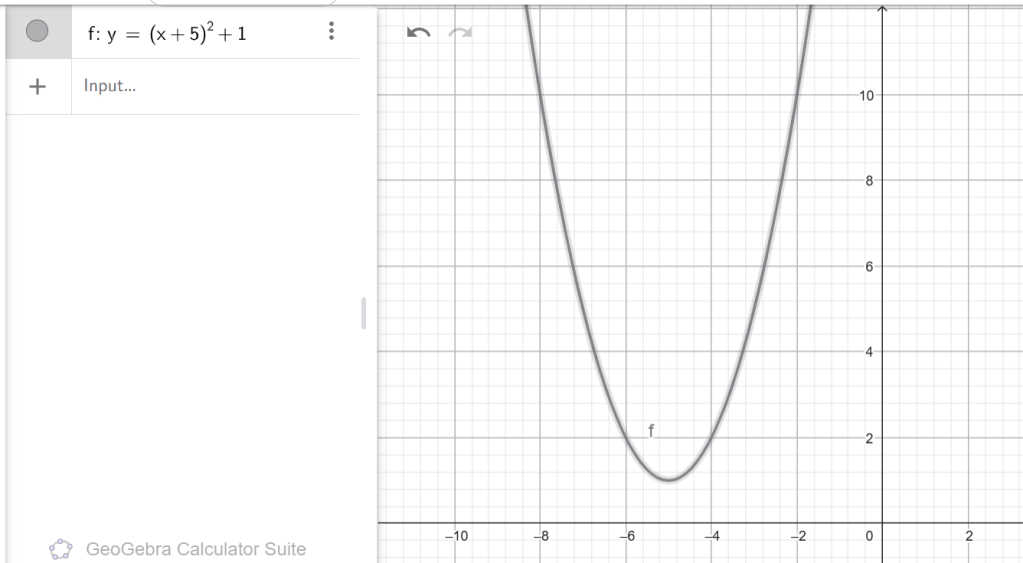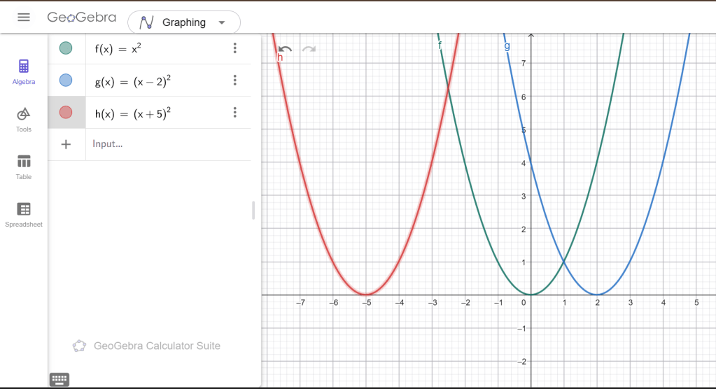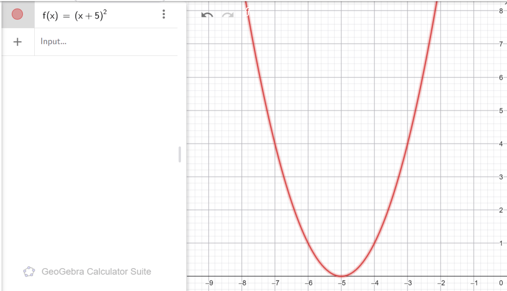 1․ Գծել f(x) = x2 պարաբոլը։ Ո ՞ր ֆունկցիայի գրաֆիկը կստացվի, եթե f(x)-ի գրաֆիկը տեղափոխենք ա) 2 միավորով աջ, բ) 5 միավորով ձախ։