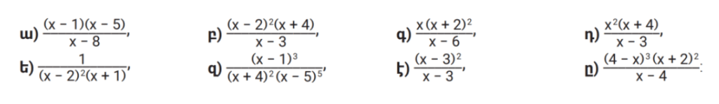 4․ Գտնել արտահայտության նշանապահպանման միջակայքերը և պարզե՛ք նշանը տրված կետում․ ա) − x2 − 5x − 6, x = −1, բ) 3 x2 − 7x + 4, x = 5, գ) 2x2 − 9x + 10, x = 3։